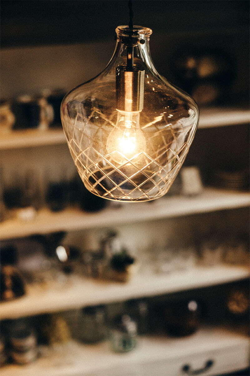 フラワーベースのようなガラスシェードに切り子をあしらい、工芸品のように仕上げました。